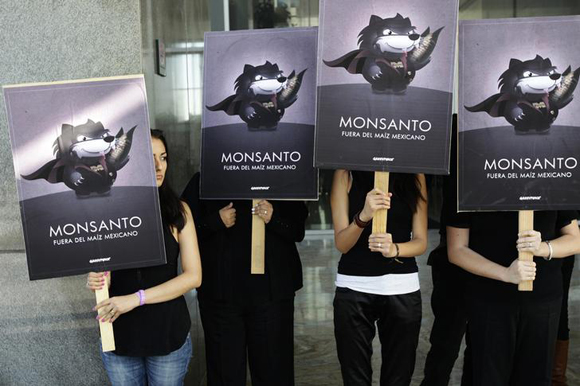 Greenpeace activists hold placards during a demonstration at Monsanto company offices in Mexico City. Reuters Archive.
