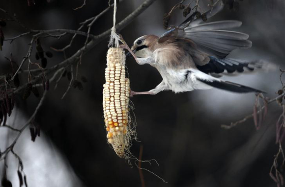A bird eats corn on a winter day in the Sharr mountains, southeast of Kosovo, Kosovo. Reuters Archive.