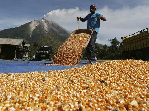 A worker lays corn out to dry as Mount Sinabung spews ash and hot lava in the background at Simpang Empat village in Karo district, Indonesia’s North Sumatra province, Indonesia. Reuters Archive