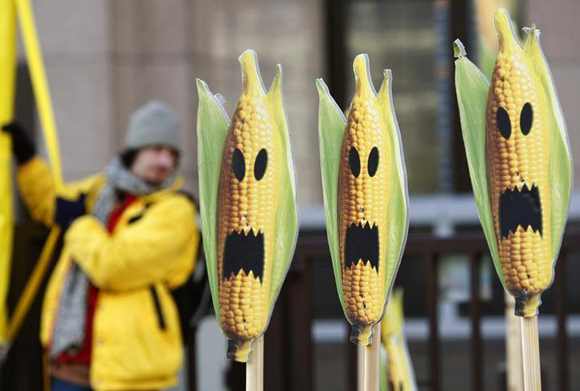 A Greenpeace activist displays signs symbolising genetically modified maize crops during a protest in front of the European Union headquarters in Brussels, Belgium. Reuters Archive
